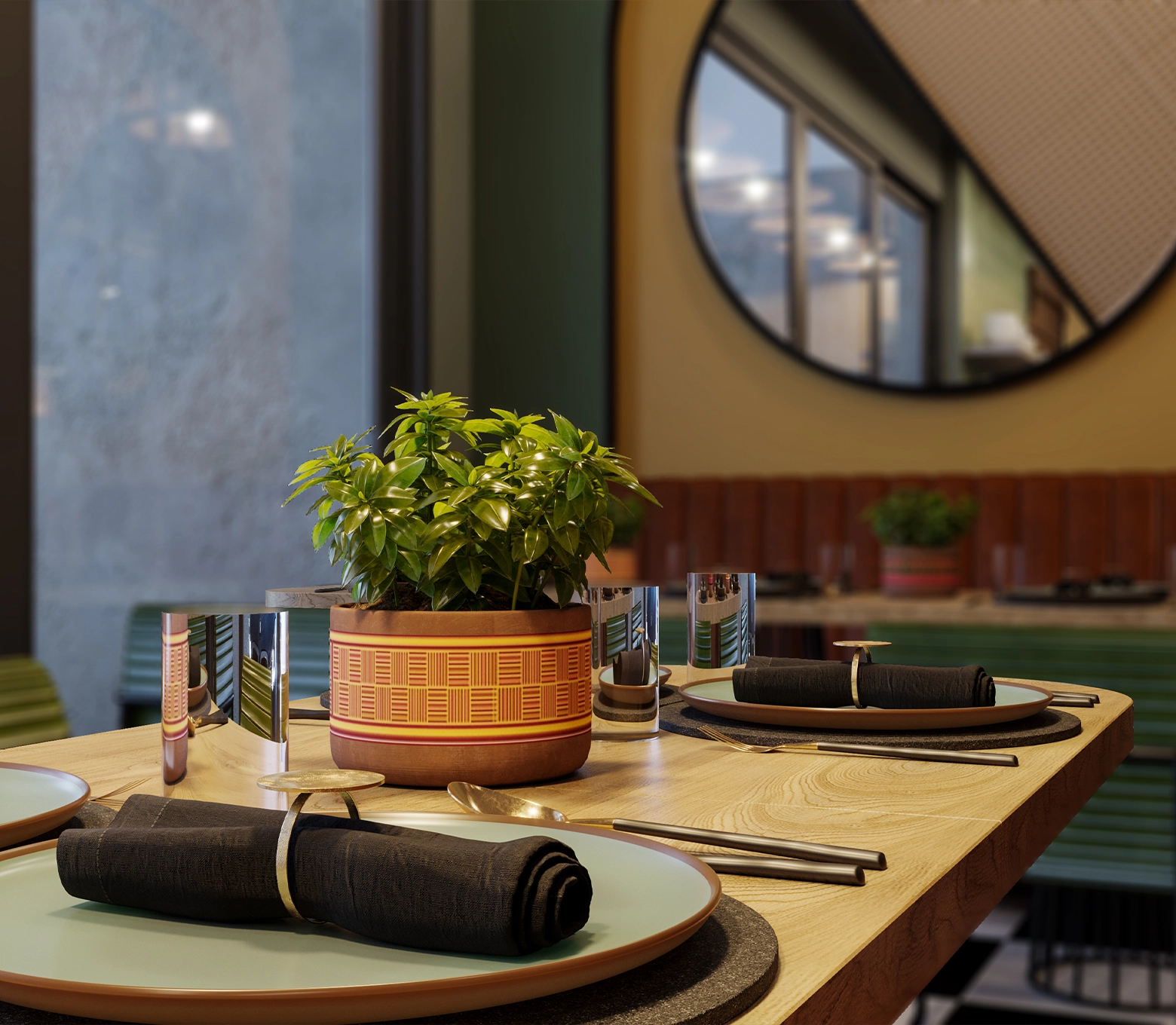 The rooftop lounge offers an exceptional retreat where guests can unwind, enjoy cascading plants, and take in picturesque views. Carefully curated colours and textures throughout the space create a soothing, inviting atmosphere. This project exemplifies how cultural elements, thoughtful design, and functional planning can come together to craft a memorable café experience.
